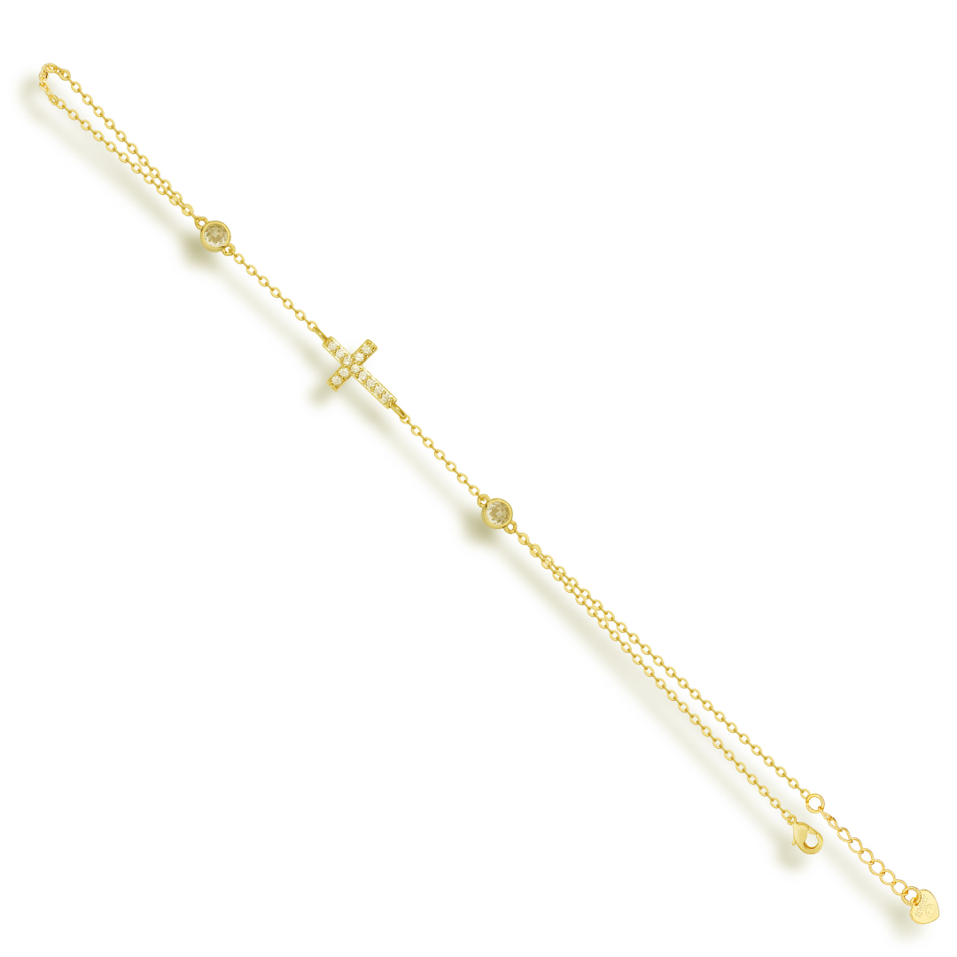 Elevate your style with our Don’t Cross Me Hand Chain! This exquisite hand chain features a dazzling pavĂ© cross and two bezel stones. adding a touch of elegance and edge to any outfit. Accessorize with confidence and make a statement with this must-have piece.